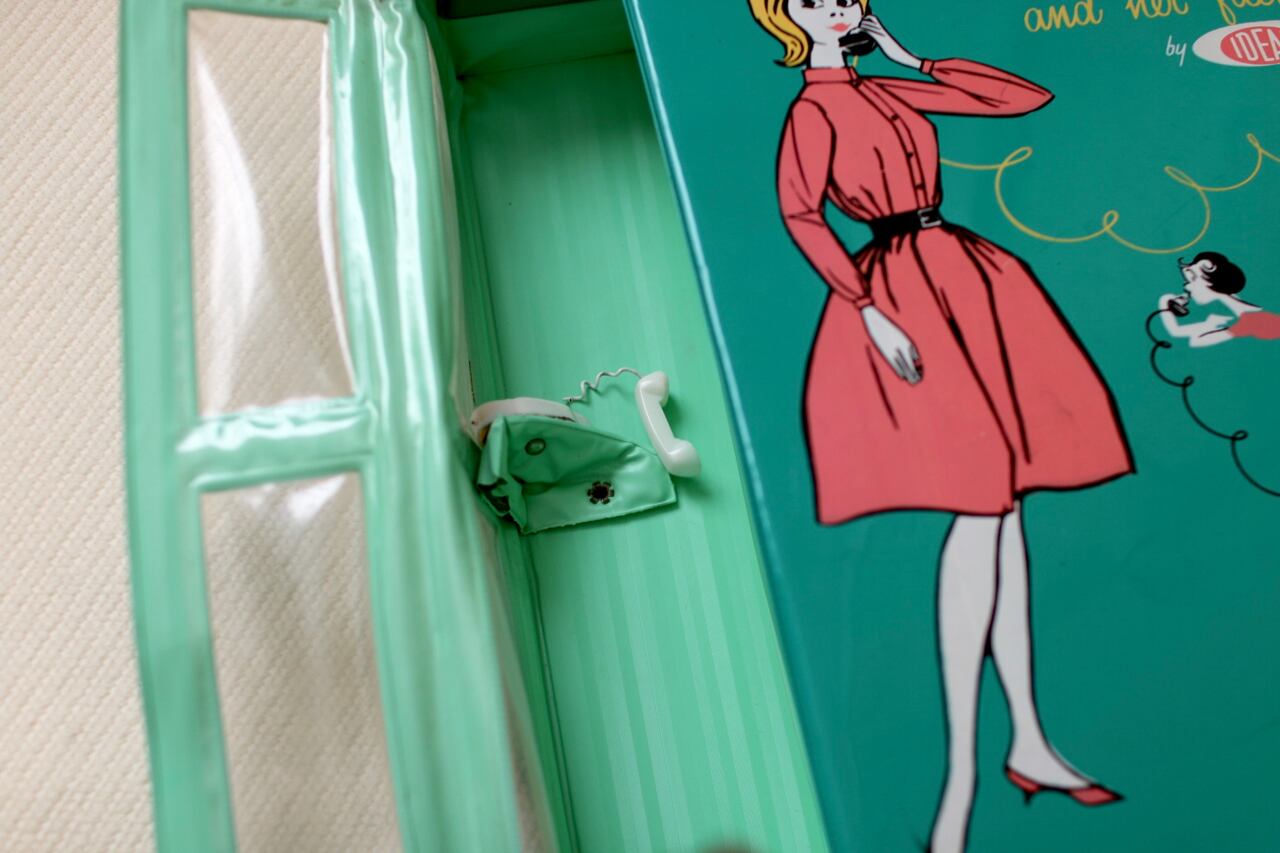 約60年前のIDEAL社タミーちゃんの正規品のドールケースです。2人同時に収納可能。お人形を入れる部分が電話ボックスになっています。お洋服もたっぷり収納できます。