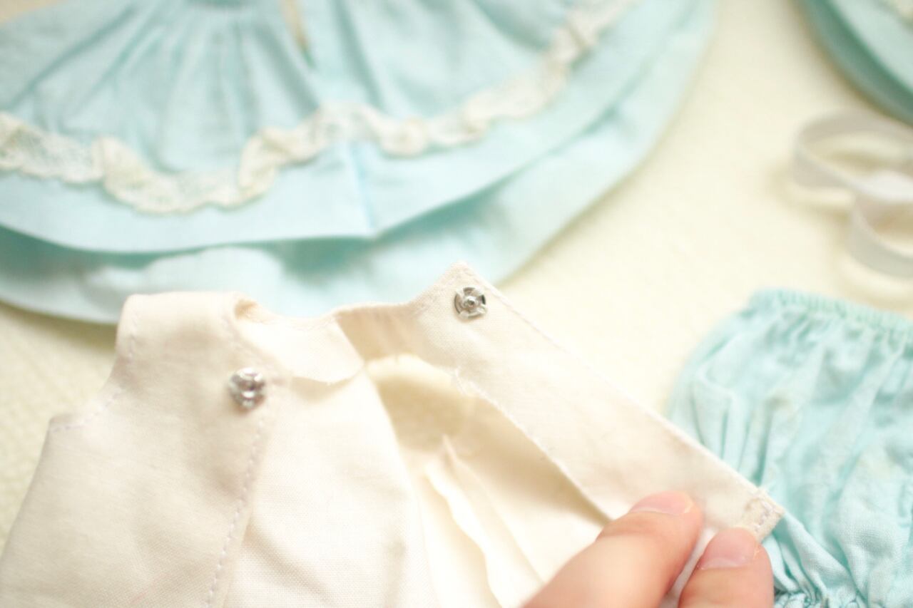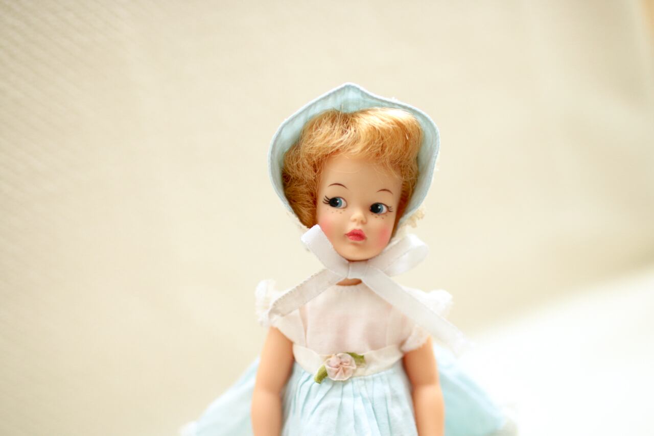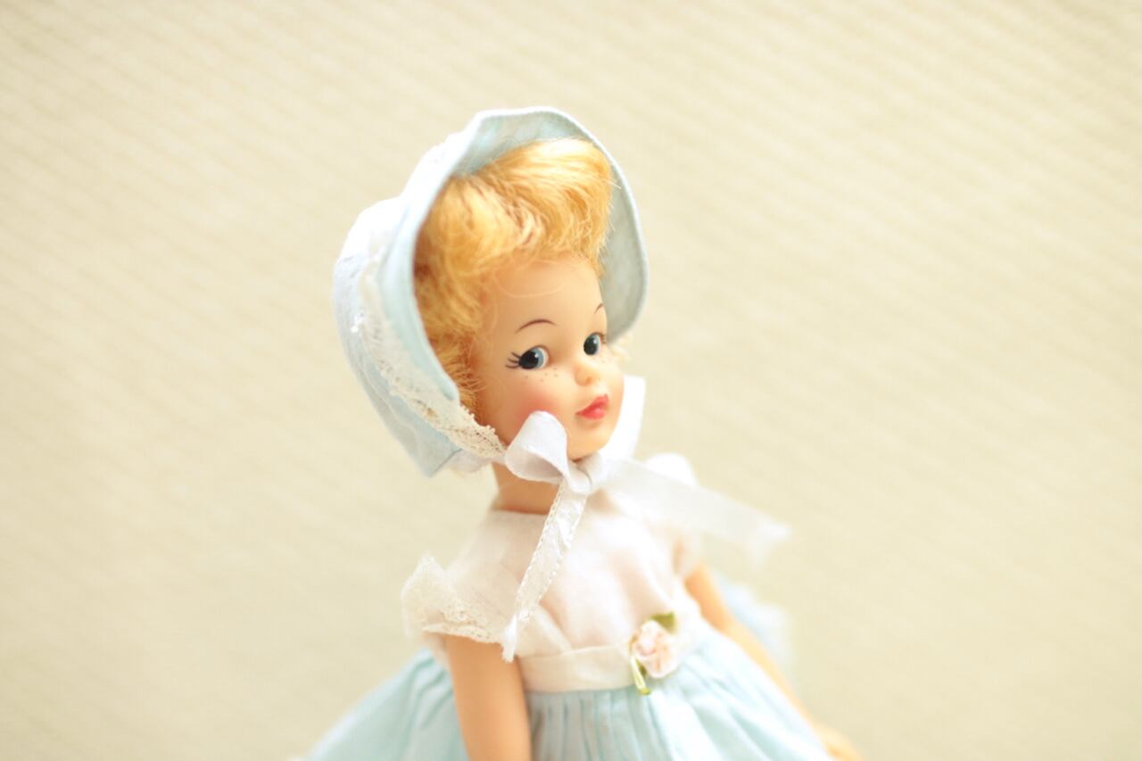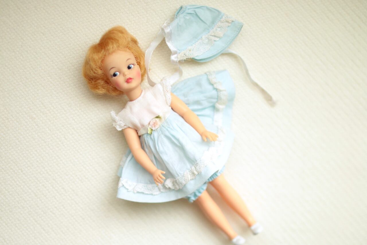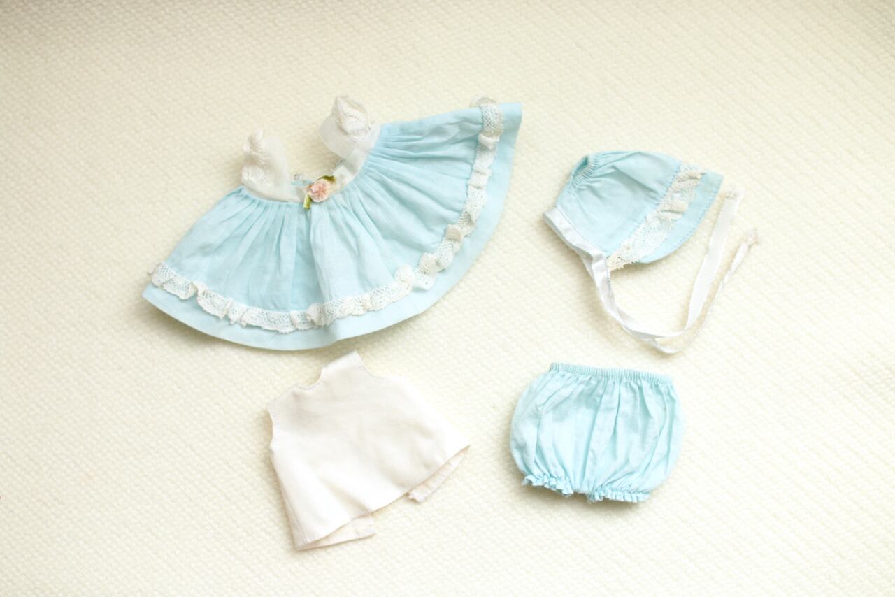 約60年前のVogue社ジニーちゃんのお洋服です。ドレープが綺麗なサークルスカートのワンピースとかぼちゃパンツ、帽子の3点セットです。8インチサイズですので、ペッパーちゃんに着せても可愛いお洋服です。また、マダムアレクサンダーの8インチドール、アイシードールちゃんにも着せていただけます。ヴィンテージ品となりますので、痛みや黄ばみなどございます。メンテナンスは行っておりますが、古いお品であることをご了承くださいませ。インナー用の白いシャツはハンドメイド品となります。おまけとしてお付けいたします。