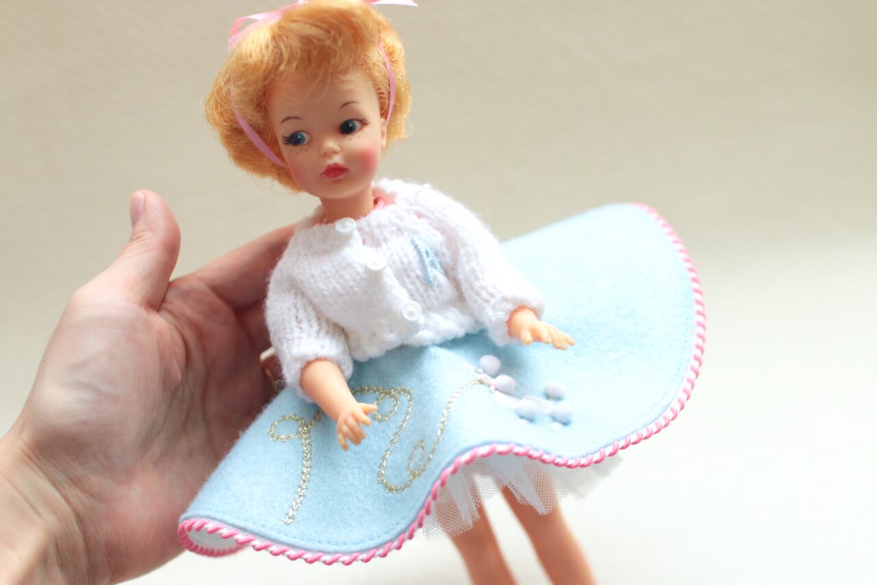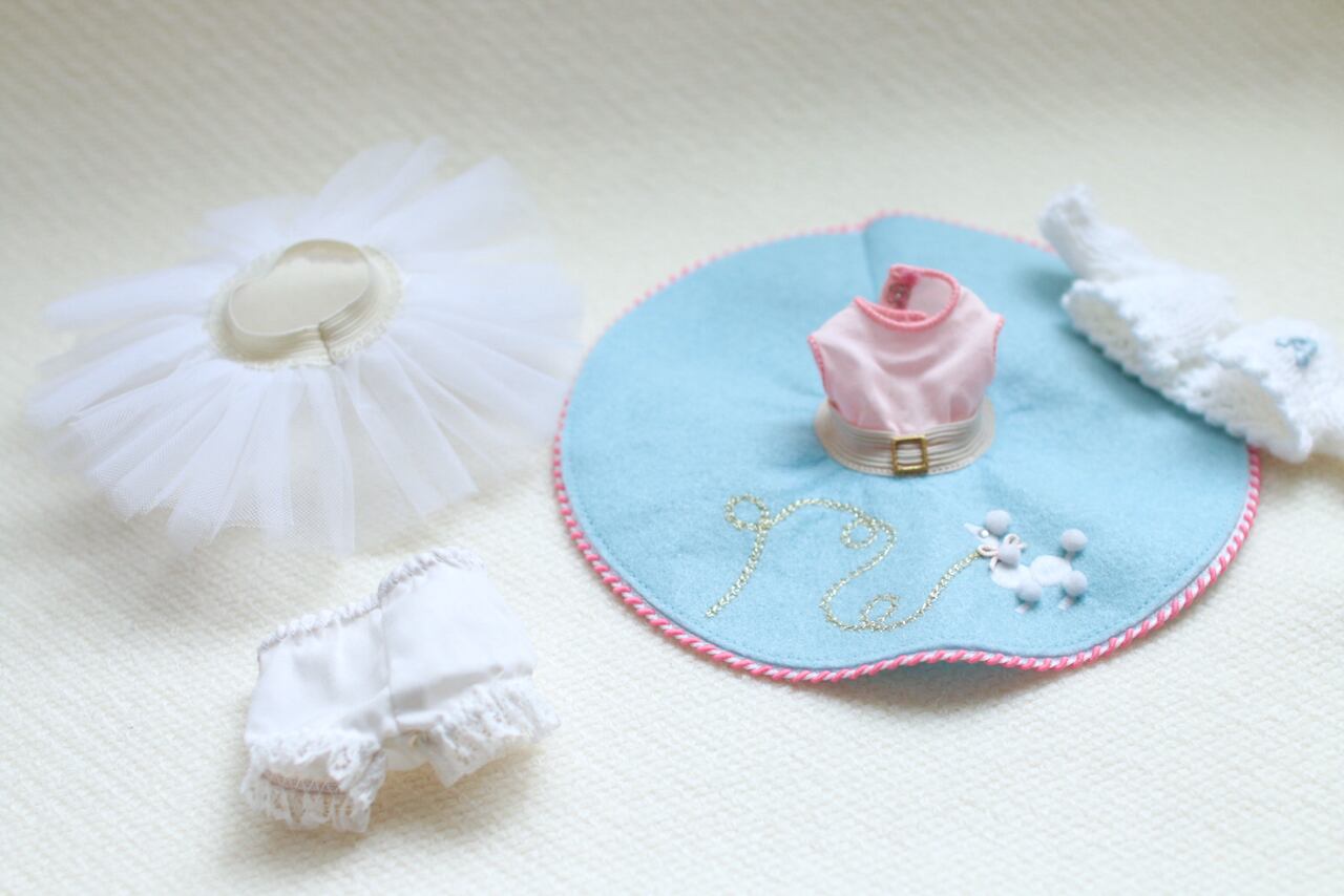 約30年前のマダムアレクサンダーのお洋服です。ペッパーちゃんにも着せていただけます。1950年代のファッションの復刻版として制作されました。スカート部分には可愛いプードルの刺繍がされています。マダムアレクサンダーの洋服のお仕立ては丁寧で美しい作りです。スカートとチュチュもサークルスカートでボリュームたっぷりです。ピンクの上着部分と、かぼちゃパンツに経年による小さな黄ばみがございます。お写真にてご確認くださいませ。チュチュ、サークルスカートワンピース、カーディガン、かぼちゃパンツの4点セットです。メンテナンスは行っておりますが、古いお品であることをご了承くださいませ。