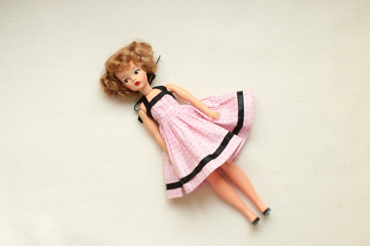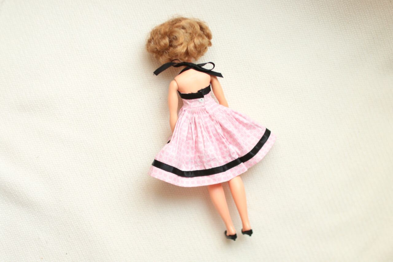 約60年前のVogue社ジルドールちゃんのお洋服です。ジルドールはジニードールのお姉さんとして登場しました。今回ご紹介のお洋服は当時の流行が反映されたピンクのドレスです。タミーちゃんにも着用していただけます。Vogue社のお洋服の特徴でもあるドレープが綺麗なサークルスカートのワンピースでsす。ヴィンテージ品ですが、大変状態の良いお品です。また、メンテナンスは行っておりますが、古いお品であることをご了承くださいませ。