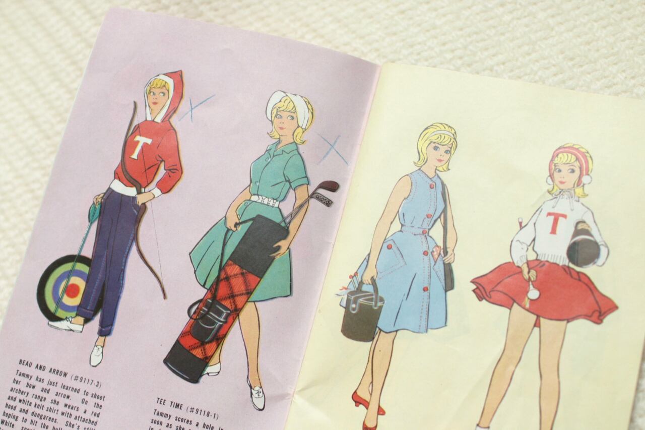 1960年代日本でも爆発的な人気を誇ったアメリカIdeal社のタミーちゃん人形。当時の日本での人気の高さから、ドール本体だけでなく、世界中で販売されるアウトフィットも日本で作られていました。当時の縫製の素晴らしさは、今見ても素晴らしく見惚れてしまうものばかりです。こちらのカタログは販売当時のもの。イラストを見るだけでもワクワクしてしまいますね。1960年代の洋服のデザインを知ることもできます。集めたお洋服をチェックするのが主流だったようで、中に書き込みのあるものが多いです。こちらのお品にも書き込みがございますので、お写真にてご確認くださいませ。