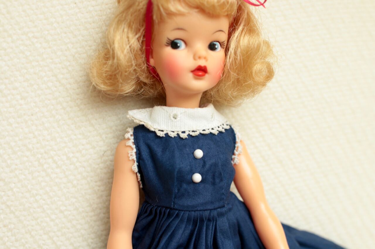 約60年前のVogue社ジルドールちゃんのお洋服です。ジルドールはジニードールのお姉さんとして登場しました。今回ご紹介のお洋服はジルドール販売当時の1950年代の流行が反映されたドレスです。タミーちゃんにも着用していただけます。Vogue社のお洋服の特徴でもあるドレープが綺麗なサークルスカートのワンピースです。ヴィンテージ品ですが、大変状態の良いお品です。メンテナンスは行っておりますが、古いお品であることをご了承くださいませ。