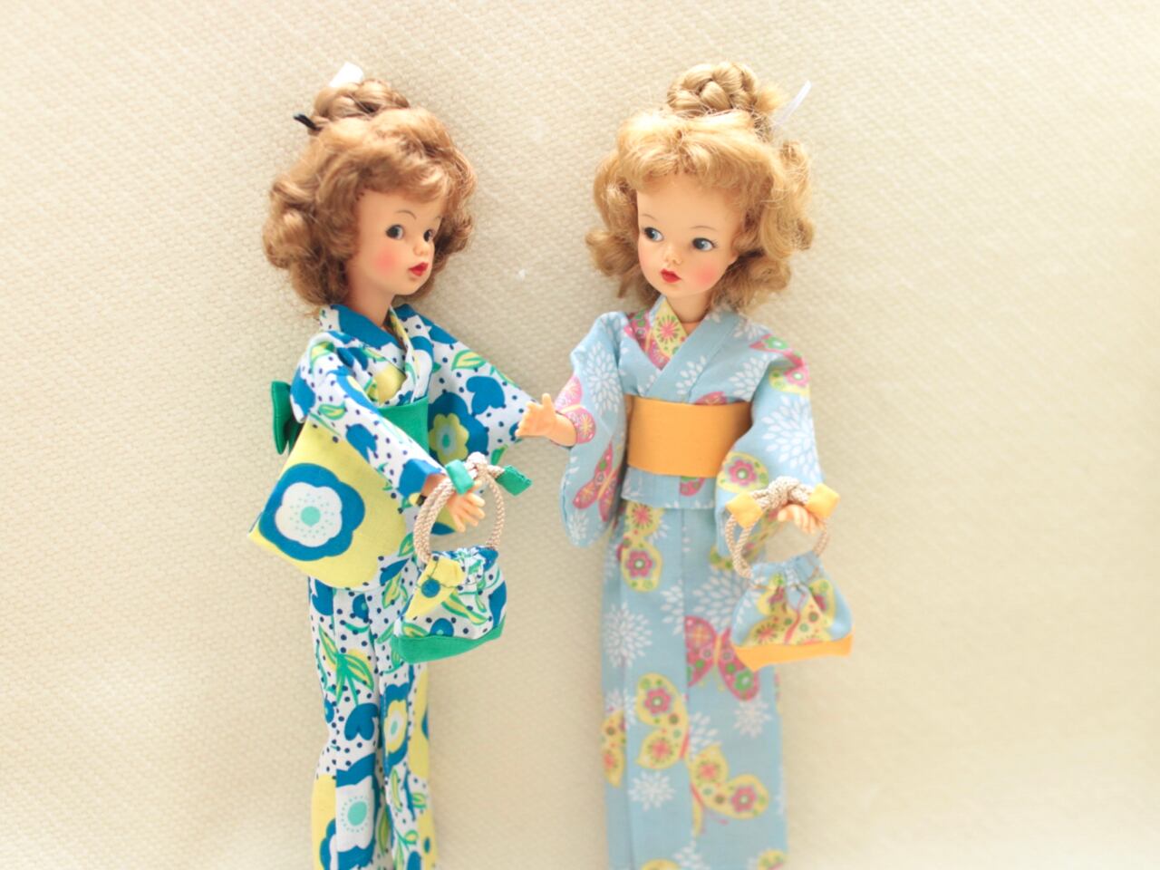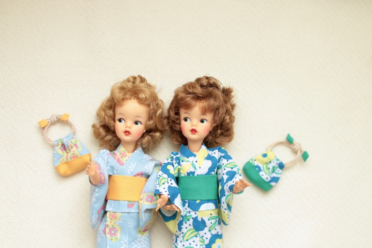 こちらはハンドメイド品となります。夏に向けてタミーちゃんサイズの浴衣をご用意いたしました! 浴衣と同じ生地で作られた巾着、リボン付きの帯、ideal社製(made in hongkong)のサンダルもセットにいたします。浴衣はとても丁寧に美しく仕立てられた一点ものです。浴衣、帯共にマジックテープで簡単に着せていただける作りとなっております。