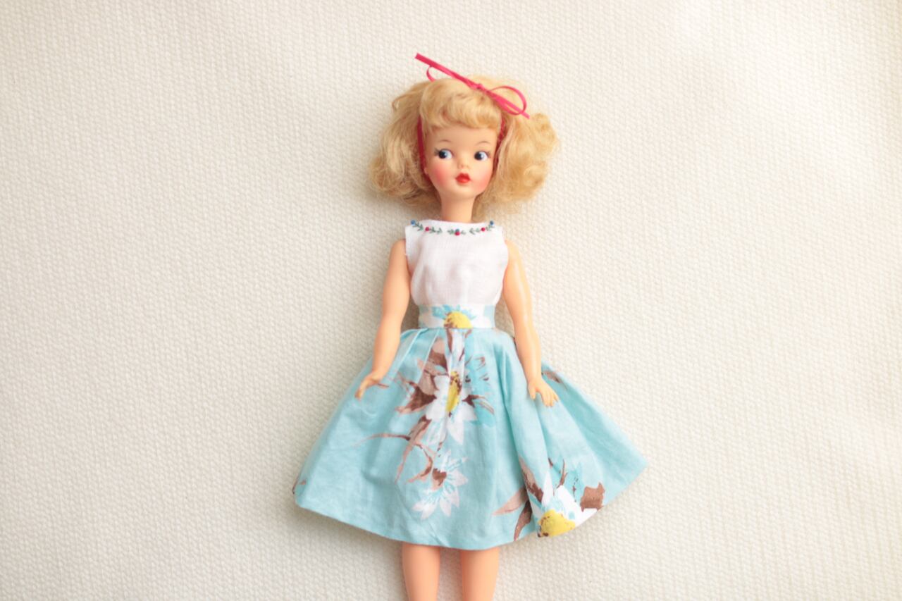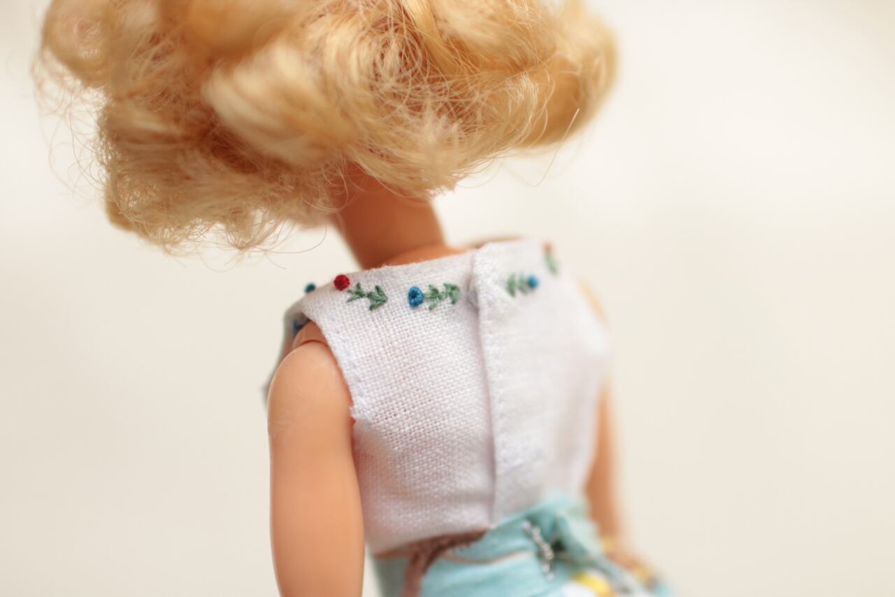 こちらはハンドメイド品となります。麻生地を使ったシンプルなシャツの襟元にタミーちゃんに似合う赤とブルーの糸で刺繍を刺しました。後ろあきのスナップボタンで着せていただけます。