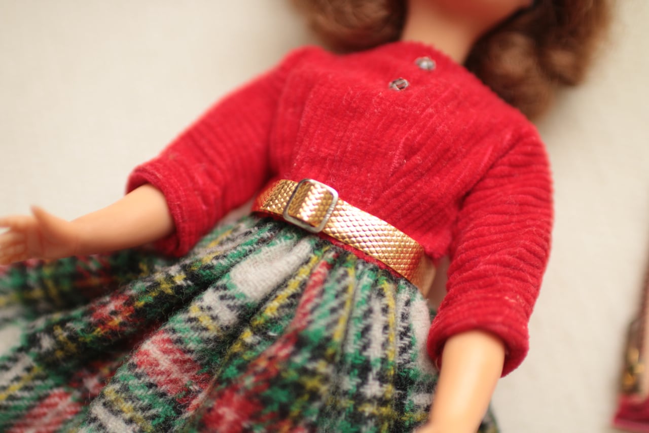 厚手の生地のワンピースにはキラキラと光る飾りがついています。タミーちゃんのアウトフィットは1960年代当時日本で製作されていましたが、今回セットでお付けしているゴールドのベルトにも、バックル部分に小さく「JAPAN」の文字が刻まれています。