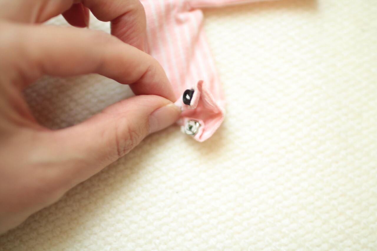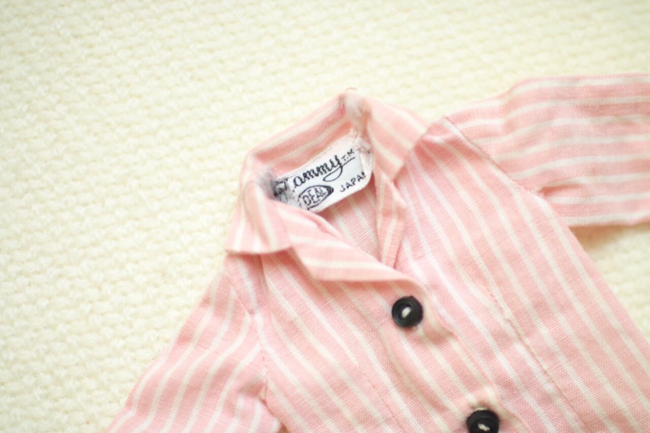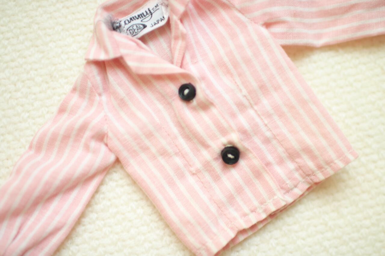 Ideal社製のタミーちゃんオリジナルのお洋服です。小さなボタンが袖にまで付いた、オリジナルのストライプシャツです。黒い鞄と合わせてコーディネートしても素敵です。