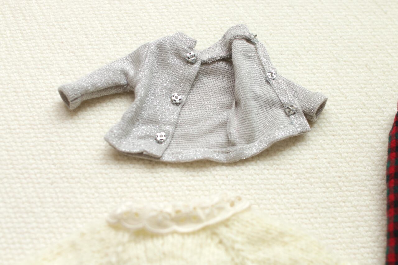 水色のギンガムチェックの生地でスタイリッシュなパンツを制作していただきました。タックが入ったスッキリとした印象のパンツです。また、飾りつきのインナーニットと、手編みのカーディガンをお付けいたしました。お手持ちのお洋服と組み合わせて着せていただくこともできるセットです。