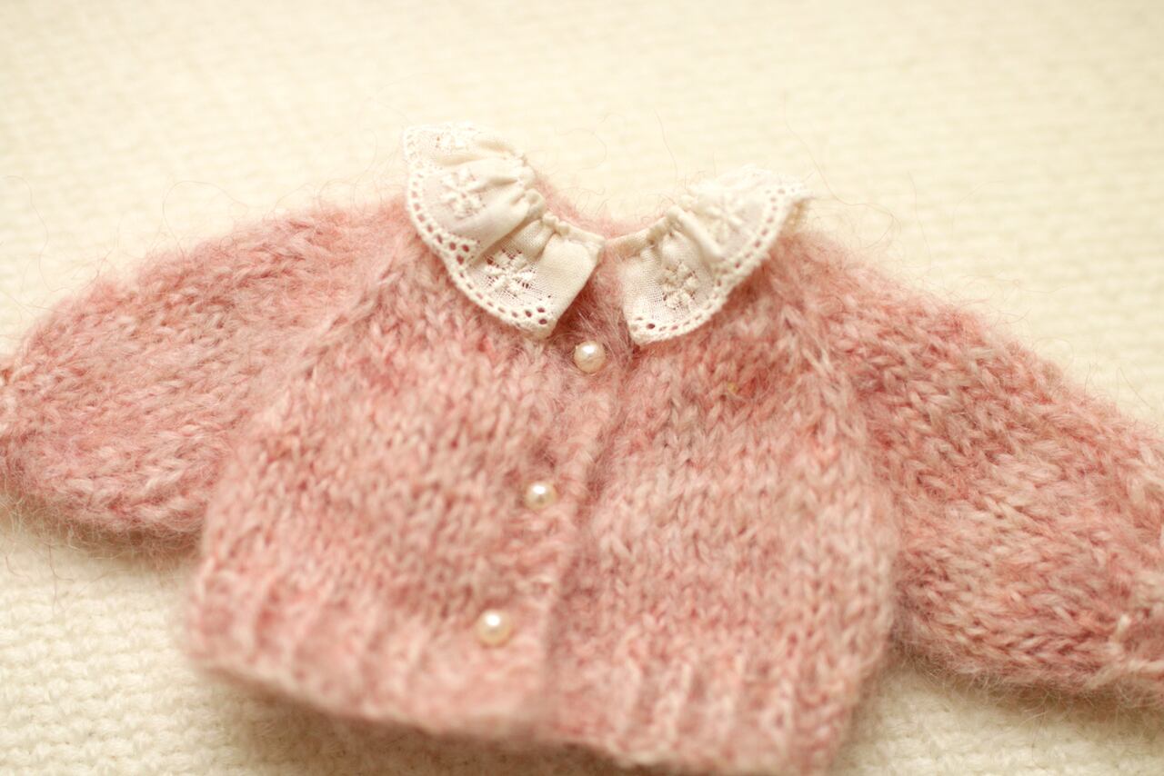 タミーちゃんサイズの手作りのニットカーディガンです。ふわふわの毛糸でタミーちゃんをイメージして製作いたしました。襟にはレースをボタンの代わりにパールの飾りをお付けつけいたしました。